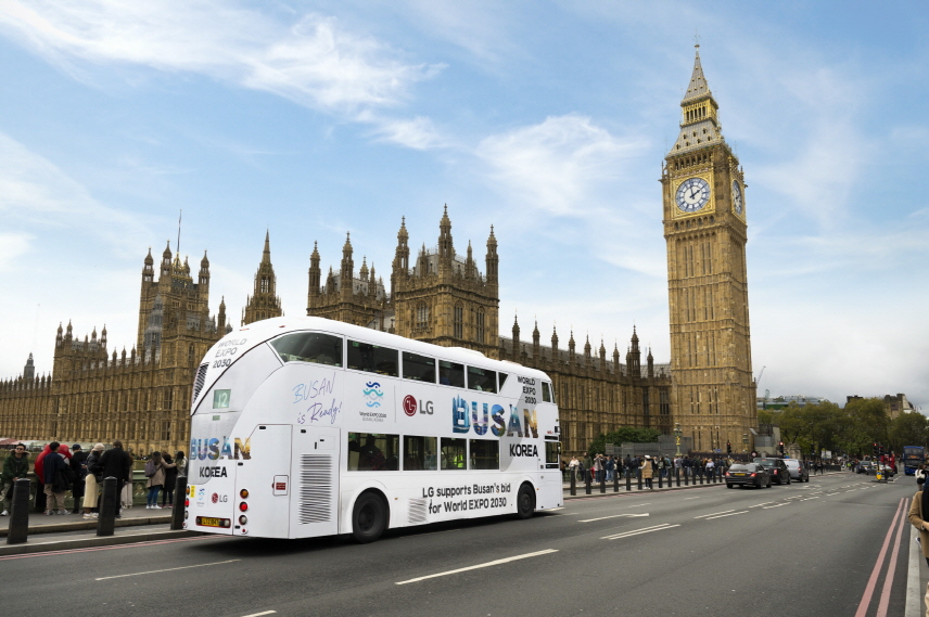 LG는 현지시간 23일부터 영국 런던에서 ‘부산이 엑스포를 유치할 준비가 되었다’는 의미의 ‘BUSAN is Ready’ 등 부산엑스포 유치 지원 메시지를 붙인 2층 버스인 ‘엑스포 버스’ 210대를 운영한다.