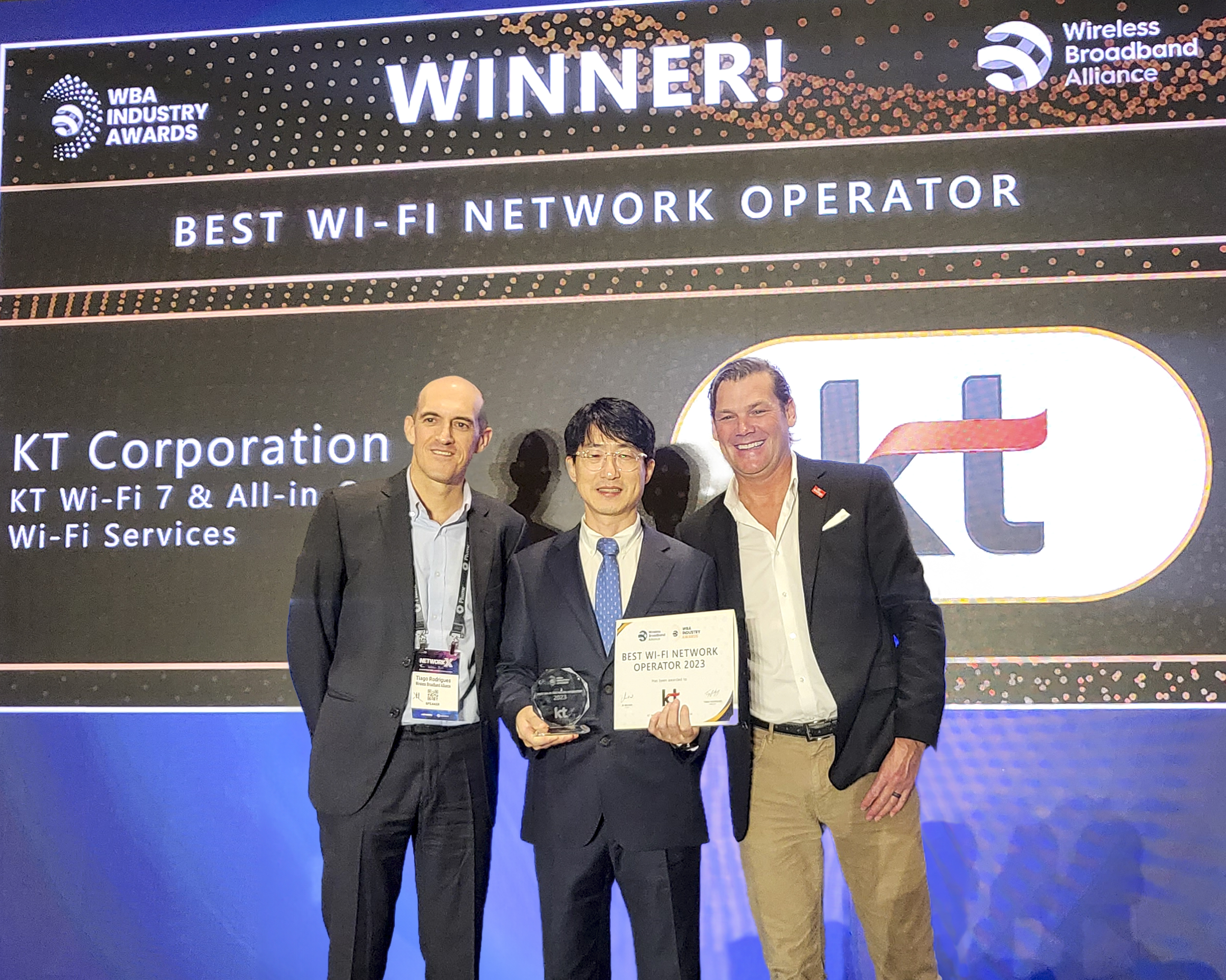 WBA 어워드는 전 세계 와이파이 분야에서 가장 뛰어난 성과와 혁신을 이뤄낸 기업을 선정하는 최고 권위의 글로벌 시상식이다. KT는 2022년에 이어 3년 연속으로 ‘최고 와이파이 네트워크 사업자’ 부문을 수상하는 쾌거를 이뤘다.
