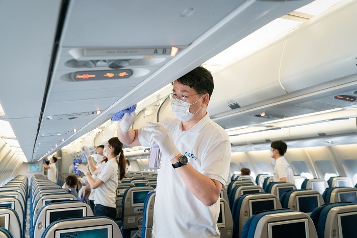 대한항공은 6월 29일 오전 서울 강서구 대한항공 본사 격납고에서 임직원이 직접 기내 소독 작업을 실시했다. 이날 소독 작업은 대한항공 임직원들이 직접 손걸레로 닦아내며 코로나19 상황에서 항공기에 탑승하는 승객들과 공감하는 한편, 안전한 기내 환경을 조성하겠다는 임직원들의 의지를 다지기 위해 마련됐다.