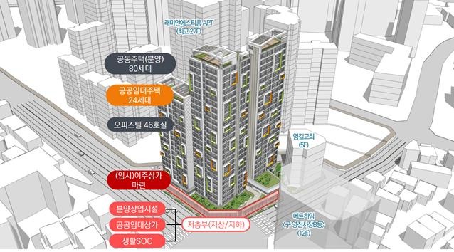LH는 재난위험시설물 붕괴 우려 등에 대한 주민의 안전 확보를 위해 조기 이주를 시행하고, ’24년 준공을 목표로 부지면적 2,754m2, 지상 25층 규모로 공동주택 104세대 및 공공임대상가와 생활SOC시설이 포함된 판매‧업무시설을 복합 개발‧공급할 예정이다.