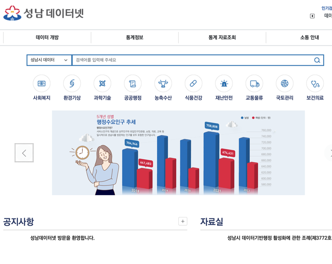 해당 사이트는 성남시가 생성·보유한 행정데이터와 통계 정보를 한 곳에서 확인할 수 있는 통합데이터 시민 개방 창구다.