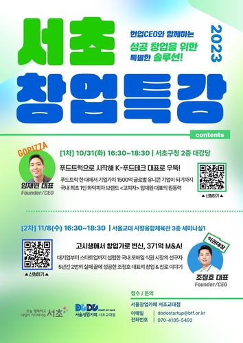 구는 오는 31일 K-푸드테크 대표기업 '고피자'의 임재원 대표, 다음달 8일 국내 모바일 식권 시장의 선구자 '식권대장'의 조정호 대표를 초청해 '현업 CEO와 함께하는 특별한 만남 '서초 창업특강'을 연다.