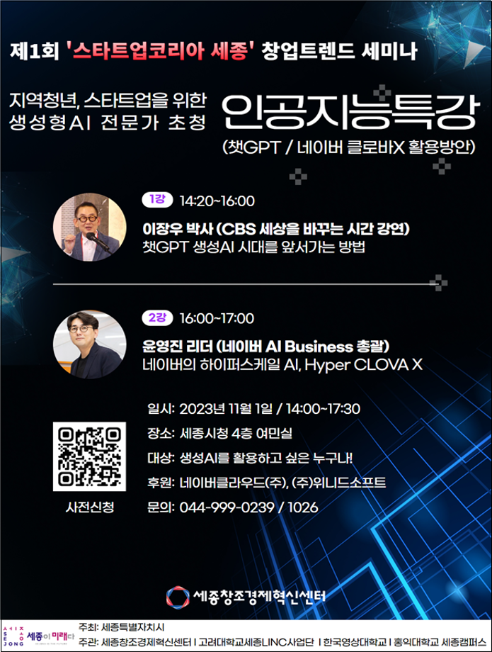 세종특별자치시(시장 최민호)와 세종창조경제혁신센터(센터장 오득창)는 11월 1일 14시 시청 여민실에서 ‘제1회 스타트업 코리아 세종 창업 트렌드 세미나’를 열고 생성형 AI 강연을 진행한다고 밝혔다.