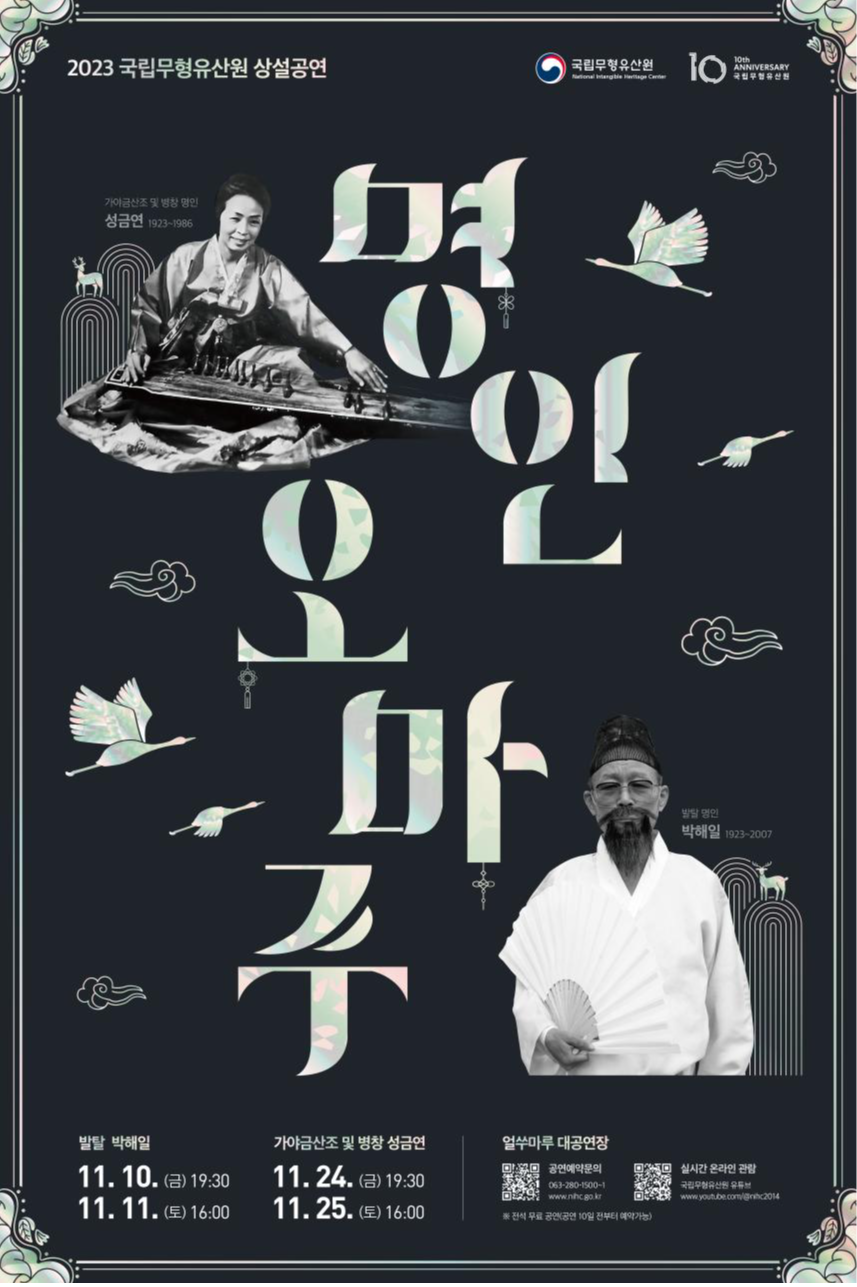 문화재청 국립무형유산원은 11월 10일과 11일, 24일과 25일 국립무형유산원 얼쑤마루 대공연장(전북 전주시)에서 「2023 명인오마주-박해일, 성금연」편을 진행한다.