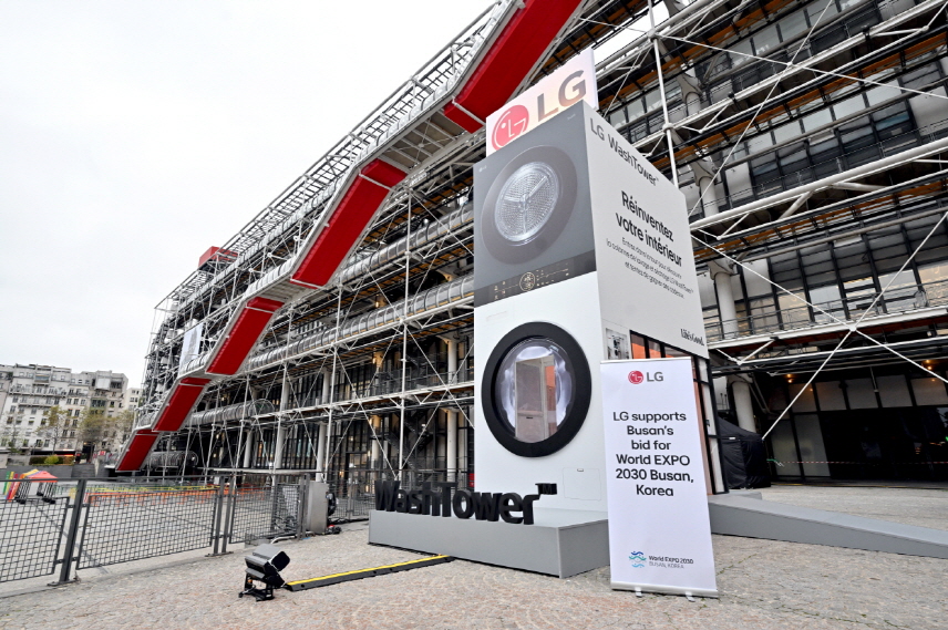 LG전자는 이번 초거대 워시타워 행사 장소에 ‘2030 부산세계박람회(엑스포)’ 유치를 응원하는 광고판을 설치해 프랑스 고객들에게 부산을 알렸다.