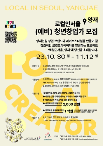서울 서초구는 양재천길 상권에 창업을 원하는 청년들을 위해 양성부터 창업까지 원스톱으로 지원하는 '로컬인서울,양재' 프로젝트를 다음 달부터 운영한다.