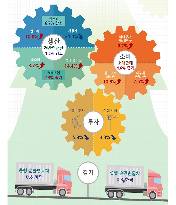 현재의 경기상황을 보여주는 동행종합지수 순환변동치는 소매판매액지수가 증가했으나 비농림어업취업자수, 광공업생산지수 등이 감소해 –0.8p 하락했다.