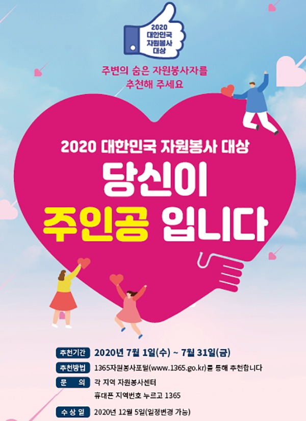 7월 1일부터 국가와 사회에 헌신한 숨은 자원봉사자와 기부자에 대해 포상하는 ‘2020년 대한민국 자원봉사대상’ 후보자 추천 접수를 시작한다.