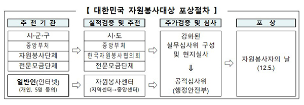 행정안전부는 후보자들에 대해 현장 확인, 공개 검증 및 공적 심사를 거쳐 오는 12월 ‘자원봉사자의 날’을 기념하는 행사에서 시상할 예정이라고 밝혔다.