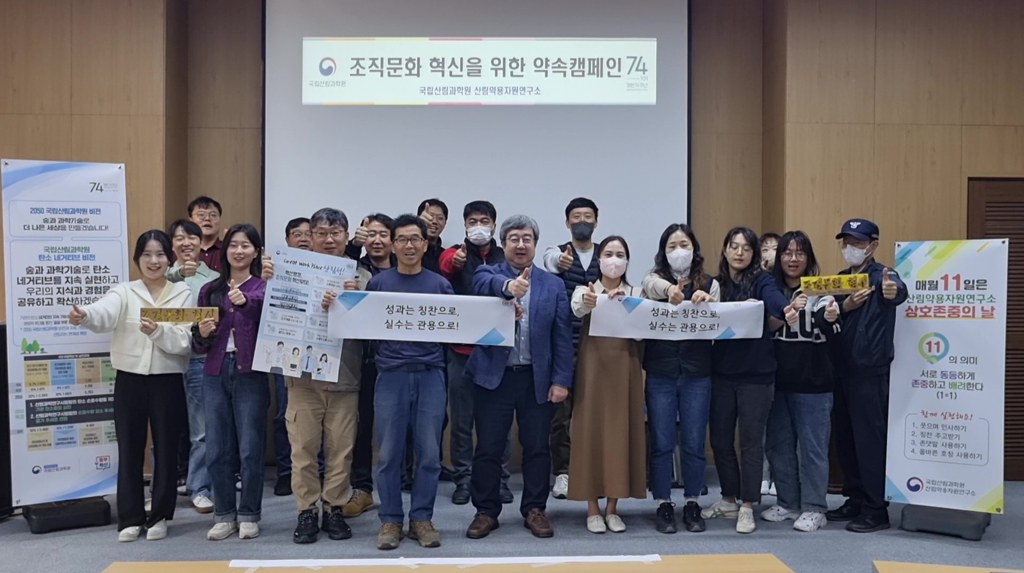 이번 캠페인은 직위와 직급, 담당업무는 서로 달라도 ‘국민건강과 임업·산촌 소득증대를 위한 연구’라는 하나의 목표를 위해 각자의 위치에서 최선을 다하는 동료임을 존중하는 건강한 조직문화를 정착하기 위해 진행되었다.