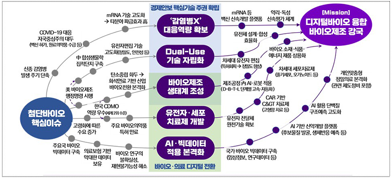 디지털·바이오의 융합으로 생명과학의 패러다임이 제조·산업 등 밸류체인 고도화 및 난제해결형·개인맞춤형 연구로 확장됨에 따라 우리 산업에도 새로운 추격의 기회가 도래할 전망이다.