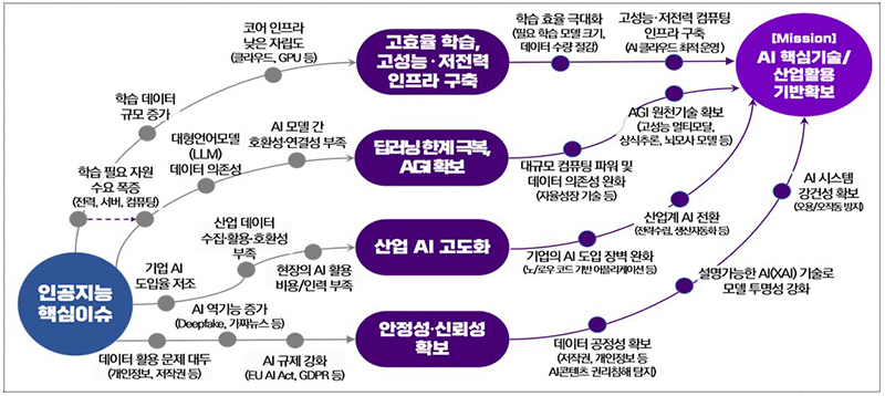 또한 신속한 기술추격을 통한 신격차 창출이 필요한 분야로, 자원의 열세를 딛고 주요국 기술대기업 중심의 경쟁구도를 뒤흔들 수 있는 고효율 AI학습모델 등 차세대·도전적 기술확보 목표를 제시했다.