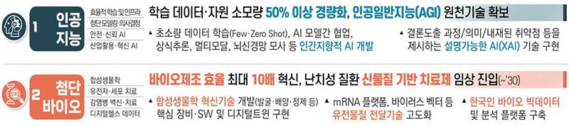 미래혁신의 핵심이 되는 인공지능과 첨단바이오 분야에서 2030년까지 달성해야 할 국가임무와 이를 위한 핵심 기술목표 및 투자·정책방향도 제시했다.