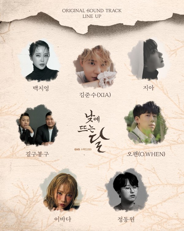 공개된 이미지에 따르면 이번 ‘낮에 뜨는 달’의 OST에는 가수 백지영과 김준수(XIA)를 비롯해 지아, 길구봉구, 오왠, 이바다, 정동원이 참여했다.