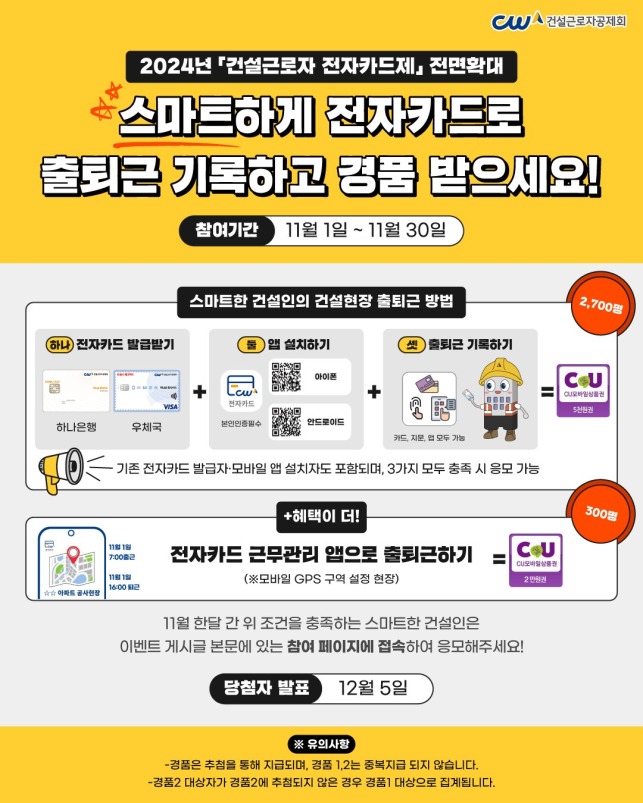 이번 이벤트는 내년부터 퇴직공제 의무 가입 대상 모든 건설공사(공공 1억 원, 민간 50억 원 이상)에서 전자카드제가 적용됨에 따라, 건설근로자가 사전에 전자카드를 발급받고 ‘전자카드’ 또는 ‘모바일 앱’으로 출·퇴근을 기록하도록 활성화하고자 마련됐다.