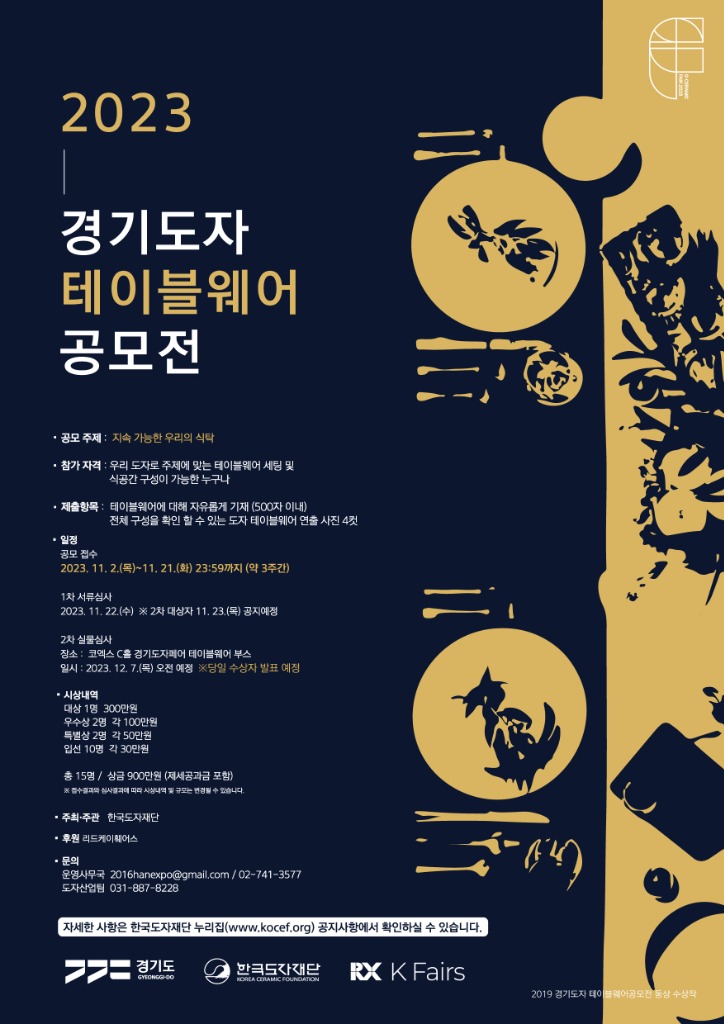 한국도자재단이 11월 21일까지 우리나라 도자 상품을 활용한 식공간 연출(테이블 세팅) 공모전 ‘2023 경기도자테이블웨어’ 참가자를 공개 모집한다.
