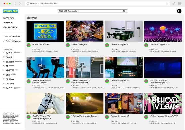 1일 낮 12시 세훈&찬열 공식 홈페이지 및 각종 SNS 엑소 계정을 통해 공개된 스케줄 포스터는 앨범명 ‘10억뷰’에 맞춰 동영상 사이트를 연상케 하는 콘셉추얼한 이미지에 앨범 트랙 리스트와 콘텐츠 오픈 일정을 담고 있어, 컴백 기대감을 높였다.