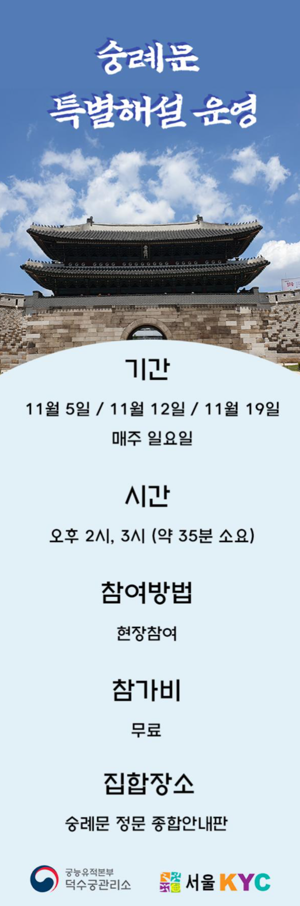 문화재청 궁능유적본부 덕수궁관리소는 11월 5일과 12일, 19일 오후 2시와 3시에 총 6회에 걸쳐 숭례문의 역사와 건축적 의미 등에 대한 자원봉사 해설사의 설명을 들을 수 있는 「숭례문 특별해설 프로그램」을 (사)서울KYC와 함께 진행한다.