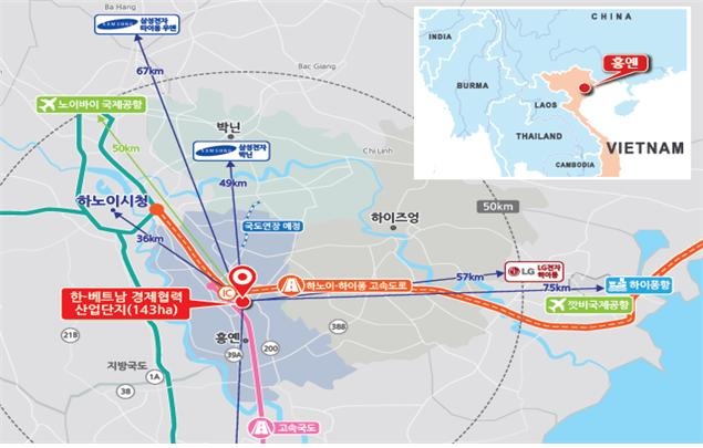 한-베트남 경협산단은 하노이 중심으로부터 남동측 약 30km에 위치한 2,645만㎡ 규모의 흥옌성 산업도시 내 조성되며, 하노이~하이퐁 간 고속도로와 인접해 인근 국제공항 및 항만으로 1시간 이내로 접근 가능하고, 배후로는 삼성, LG 등 한국 기업들의 생산시설이 위치함에 따라 기존 공장들과의 시너지 또한 창출할 수 있어 투자여건이 우수하다.