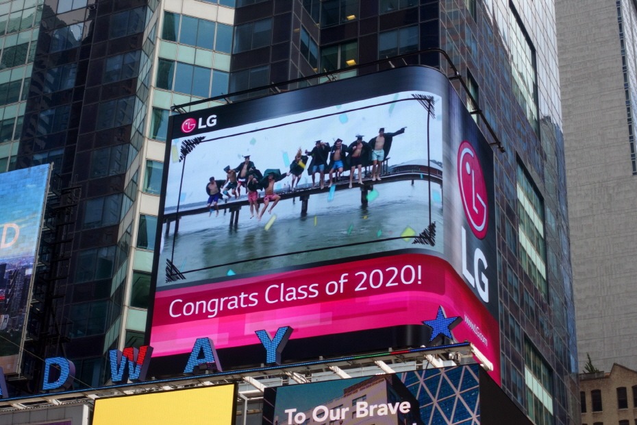 LG전자는 현지시간 지난달 30일부터 뉴욕 타임스스퀘어에 있는 LG전자 LED 전광판에 올해 학교를 졸업하는 졸업생 375명의 사진을 보여주고 있다.