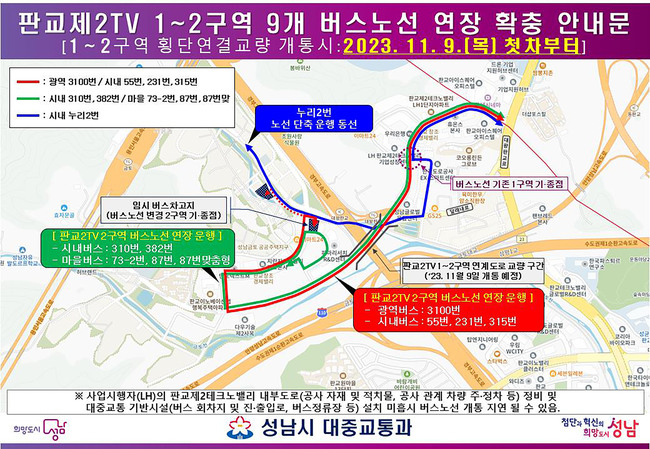 판교제2TV 1~2구역 연장 노선은 9개 노선으로 ▲광역버스 3100번(6대) ▲시내버스 55번(14대), 231번(12대), 310번(9대), 315번(17대), 382번(7대) ▲마을버스 73-2번(5대), 87번(10대), 87번맞춤형(3대) 노선 등이다.