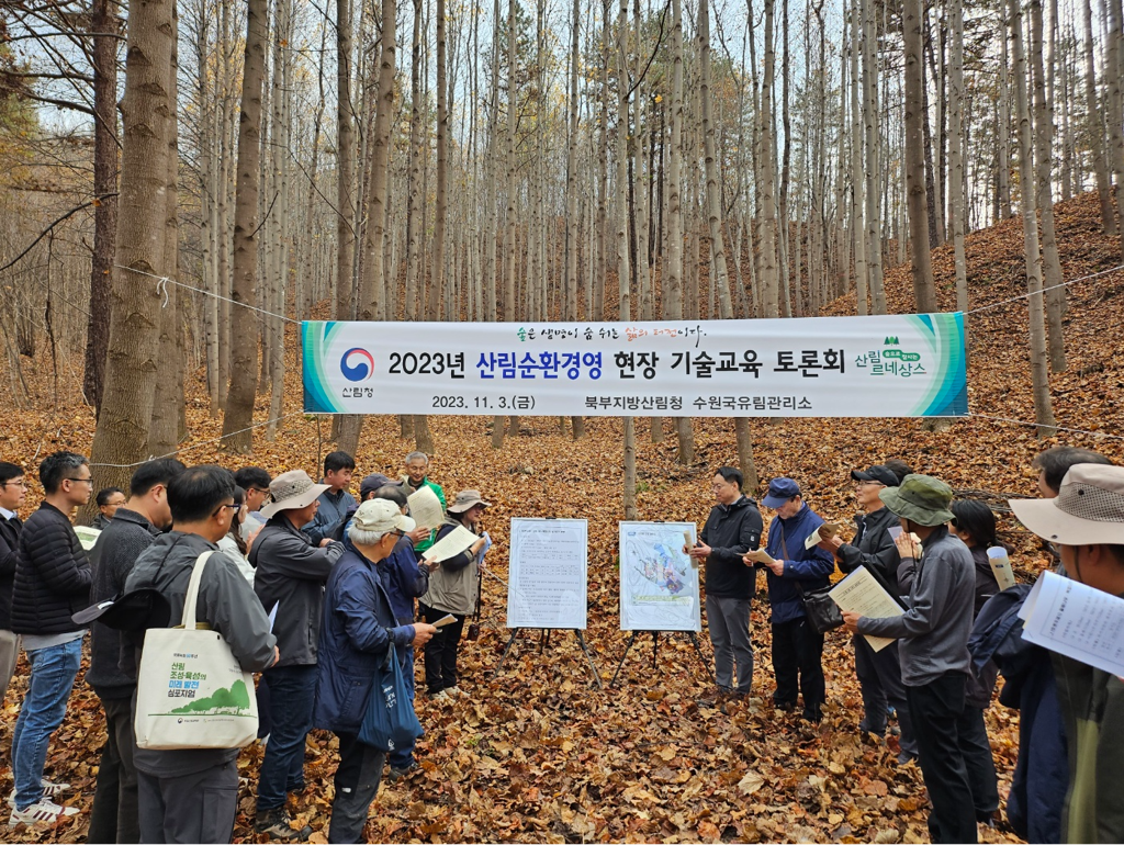 북부지방산림청은 11월 3일(금) 수원국유림관리소 다수종 시범 조림지에서 산림청, 북부청, 국유림관리소, 기술자문단 등 29명이 참석한 가운데 산림순환경영 현장토론회를 실시했다.