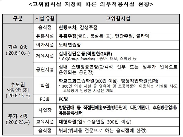 한편 전자출입명부를 의무 도입하는 고위험시설 8종은 6월 30일로 계도기간이 종료되었고, 수도권의 학원·PC방은 5일에, 새로 지정된 고위험시설 4종은 14일로 각각 계도 기간이 종료된다.