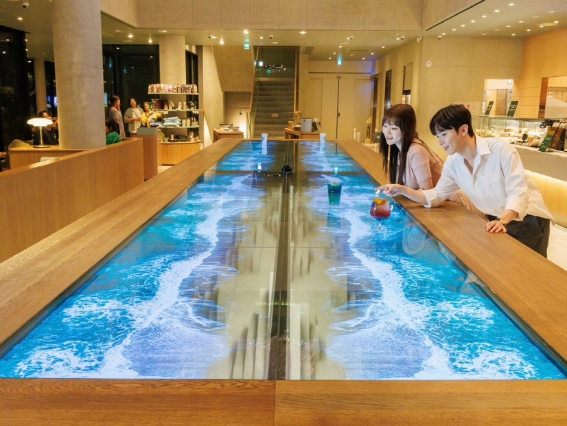 음료잔을 테이블 위에 올려놓으면 센서가 반응해 잔 주변으로 물결이 일렁이는 효과도 연출하며 고객들로부터 호응을 얻고 있다.