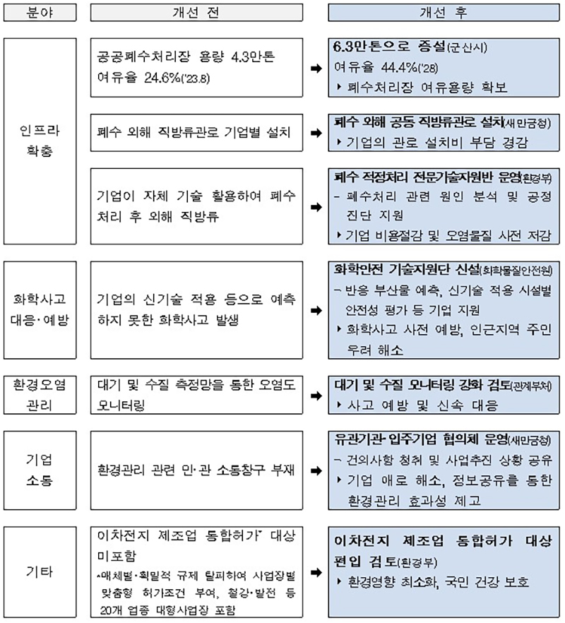 먼저 발생 가능한 오염물질의 적정 처리를 위해 공공폐수처리장과 폐기물처리장 등의 환경기초시설 증설을 추진하며, 기업 지원을 위해 폐수 공동관로를 설치하고 환경부를 중심으로 전문기술지원반을 운영한다.