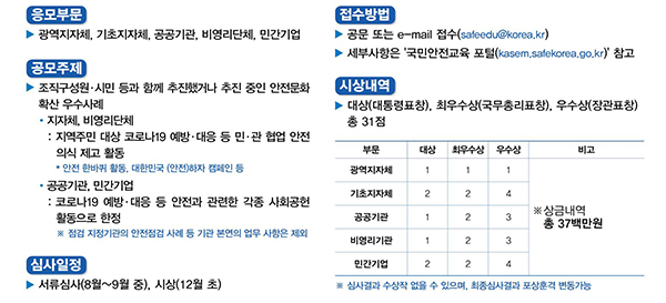 한편 안전문화 우수사례 공모서류와 접수 방법 등 보다 자세한 내용은 국민안전교육포털 누리집(http://kasem.safekorea.go.kr)에서 확인하면 된다.