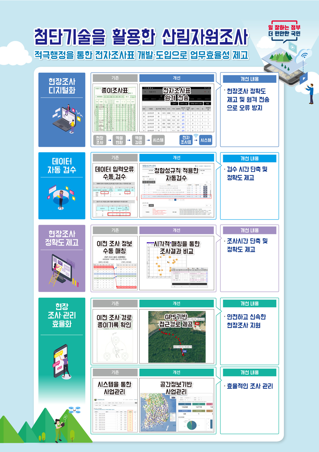 우수사례는 전국 산림의 현황을 조사하는 국가산림자원조사에 전자조사표를 도입하여 현장조사의 정확도를 획기적으로 개선한 내용과 일반 국민이 통계를 쉽게 이용하고 볼 수 있도록 누리집에 시각화 기능을 개선한 내용이다.