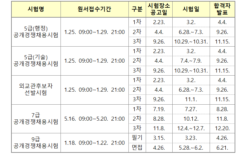 내년도 5급 및 외교관후보자 선발 1차 시험은 3월 2일, 7급 1차 시험은 7월 27일, 9급 필기시험은 3월 23일에 각각 진행된다.