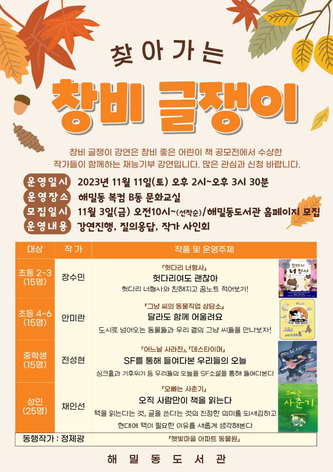 해밀동도서관에서는 ‘헛다리 너 형사’ 장수민 작가, ‘그냥 씨의 동물직업 상담소’ 안미란 작가, ‘어느 날 사라진’ 전성현 작가, ‘오빠는 사춘기’ 채인선 작가, ‘햇빛마을 아파트 동물원’ 정제광 작가가 참여하며 초등, 중등, 성인을 대상으로 총 4개 강연과 저자 사인회가 진행된다