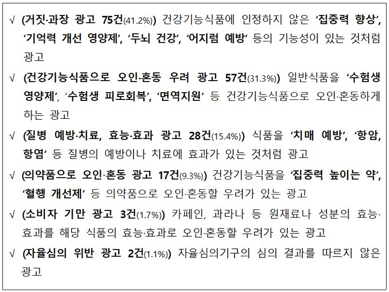주요 적발 사례로는 해당 건강기능식품에 인정받지 않은 기능성 내용인 ‘집중력 영양제’, ‘기억력 개선 영양제’, ‘두뇌 건강’ 등을 광고하거나, 일반식품을 건강기능식품 또는 의약품으로 오인·혼동하게 하는 광고 등이다.