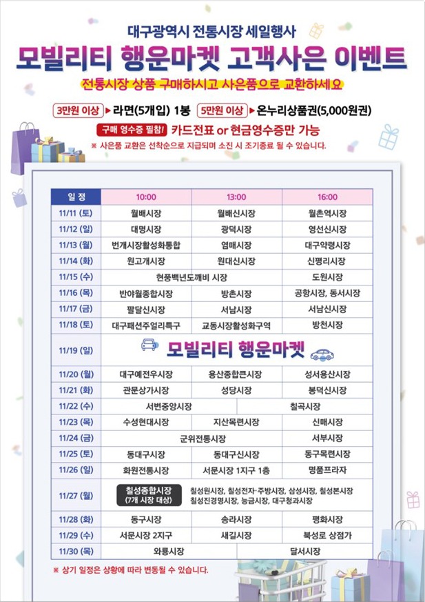 먼저, 11월 11일부터 30일까지 20일간 모빌리티 행운마켓 차량이 시장을 방문해 일정금액 이상 구매고객에게 온누리 상품권 등 다양한 사은품을 증정하는 사은행사를 실시하고, 대구 전역을 다니는 행운마켓 차량을 SNS에 업로드한 시민을 대상으로 추첨을 통해 커피 쿠폰을 지급하는 인증샷 이벤트도 진행한다.