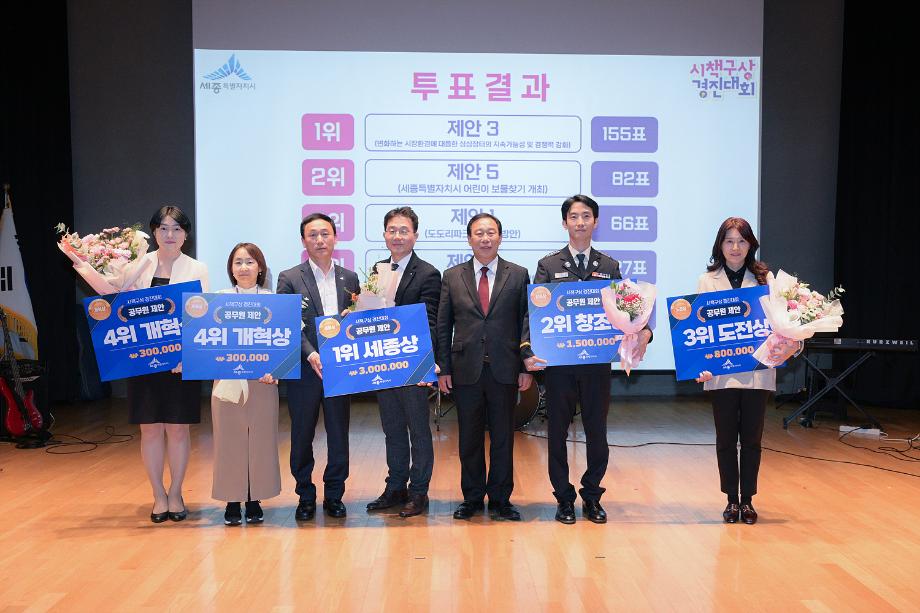 공무원 제안 우수시책으로는 ▲더 스페이스 세종(The Space Sejong) ▲싱싱장터의 지속가능성 및 경쟁력 강화 ▲도도리파크 활성화 방안 ▲세종특별자치시 어린이 보물찾기 개최 ▲유동인구 분석을 통한 생활 기반 시설 입지 예측 제안이 선정됐다.