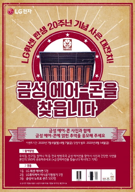 LG전자는 골드스타 에어컨에 얽힌 사연을 보내온 고객 가운데 5명을 선정해 휘센 씽큐 에어컨으로 교체해준다. 또 퓨리케어 미니 공기청정기 증정 등 다양한 혜택을 제공한다. 금성 에어컨을 발견해 소셜네트워크서비스(SNS)에 공유하는 고객에게는 추첨을 통해 LG전자가 최근 선보인 골드스타 유리컵과 골드스타 에코백 등 뉴트로 굿즈(goods)를 증정한다.
