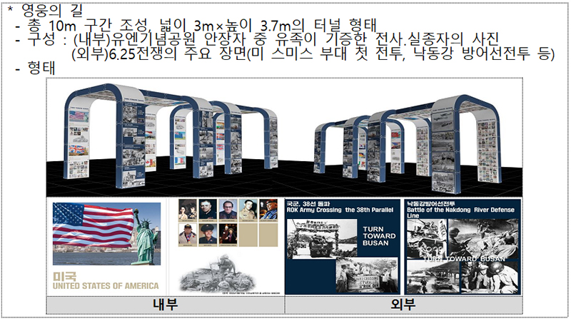 ‘영웅의 길’은 유엔 전몰장병을 추모하고 참전국과 함께한 위대한 역사를 기억하기 위해 조성된 10m 길이의 사진 전시 공간이다. 이 길을 유엔 참전용사와 주요 내빈이 함께 입장하면서 기념식이 시작된다.