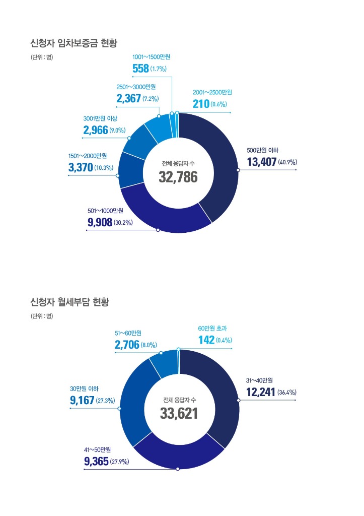 임차보증금은 500만원 이하는 40.9%, 501~1000만원 이하는 30.2%, 1501~2000만원 이하 10.3%를 차지하고 있어 선정 1순위* 대상은 총 신청자의 81.4% 이상일 것으로 예측된다.