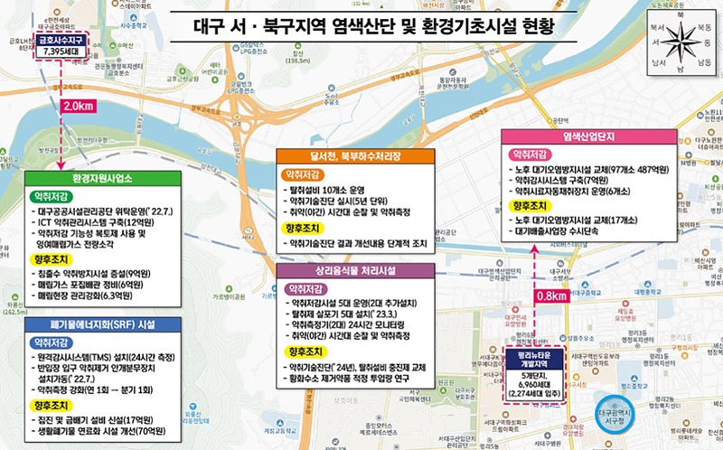 〈염색산단, 서대구산단>의 경우에는 노후 대기오염방지시설 교체대상 124개소 중 교체를 완료한 100개 사업장을 제외한 24개 사업장에 대해 교체를 완료하고, 대기오염 배출 현황과 사업성과 분석과 필요한 경우 한국환경공단에 악취실태조사 의뢰하고 염색산단 서대구역 인근에 악취 감시 센서 2개소 추가 설치, 야간시간대 대기오염배출사업장 방지시설 부적정 운영 행위 불시 단속을 지속적으로 할 예정이다.