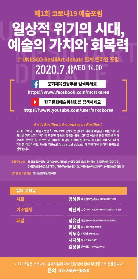 한국문화관광연구원이 주관하는 제1회 토론회는 8일 오후 2시, ‘일상적 위기의 시대, 예술의 가치와 회복력’을 주제로 유네스코가 제안한 ‘예술의 회복력 운동’(리질리아트 무브먼트, ResiliArt movement)과 연계해 열린다.