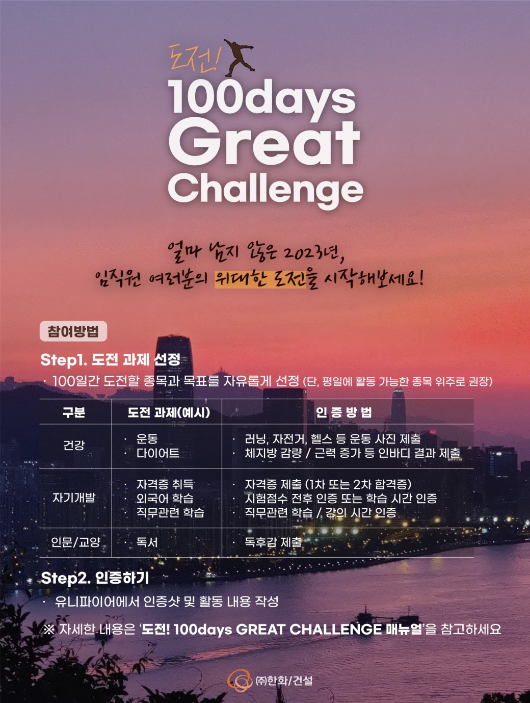 ㈜한화 건설부문이 건강한 조직문화 조성을 위해 ‘도전! 100days Great Challenge’(이하 ‘100days Challenge’)를 운영한다.