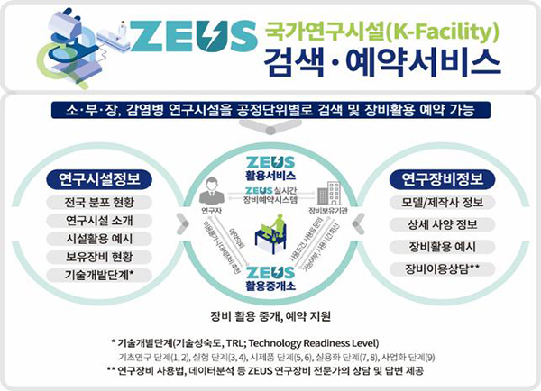 ‘K-Facility 검색·예약서비스(www.zeus.go.kr/k-facility)’는 전국에 산재된 과학기술 연구개발 지원목적의 280여개 국가연구시설을 쉽게 검색할 수 있는 지도 기반서비스이다. ‘제우스(ZEUS) 국가연구시설장비 종합정보서비스’를 통해 제공된다.