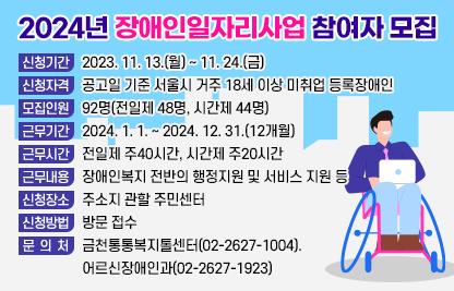 금천구는 2024년 장애인일자리사업 참여자를 모집한다고 밝혔다.
