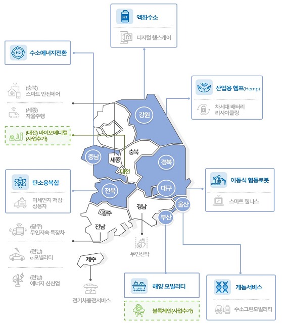 이번에 새로 지정된 특구는 부산(해양모빌리티), 대구(이동식 협동로봇), 울산(게놈서비스산업), 강원(액화수소산업), 충남(수소에너지 전환), 전북(탄소융복합산업), 경북(산업용헴프)이다.