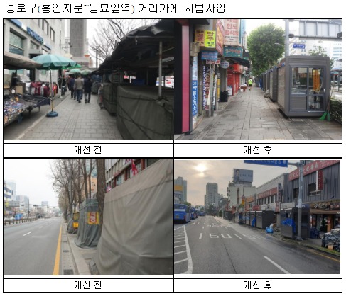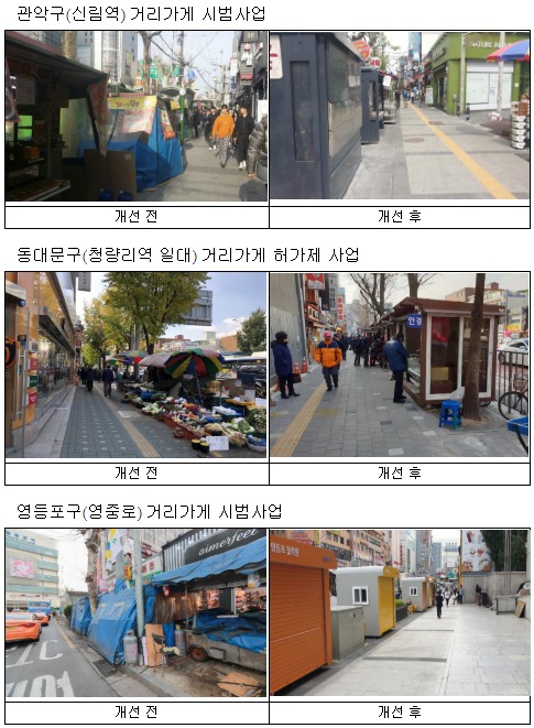 서울시는 지난해 혼잡하기로 유명했던 영등포역 앞(영중로) 거리 정비를 완료하며 약 50년간의 시민 숙원 사업을 완료했다. 관악구(신림역 일대, 5월 준공)에 이어 7월 말 종로구(흥인지문~동묘앞역) 일대까지 준공되면 총 5개 시범 사업 중 3개 사업을 완료하게 되며, 중랑구(태릉시장), 동대문구(청량리청과물시장 외) 시범사업도 차근차근 진행 중에 있다. 이밖에도 시범사업과 별개인 청량리역 일대 외 4개소의 거리가게 허가제 사업도 지난해 말 성공적으로 완료했다.