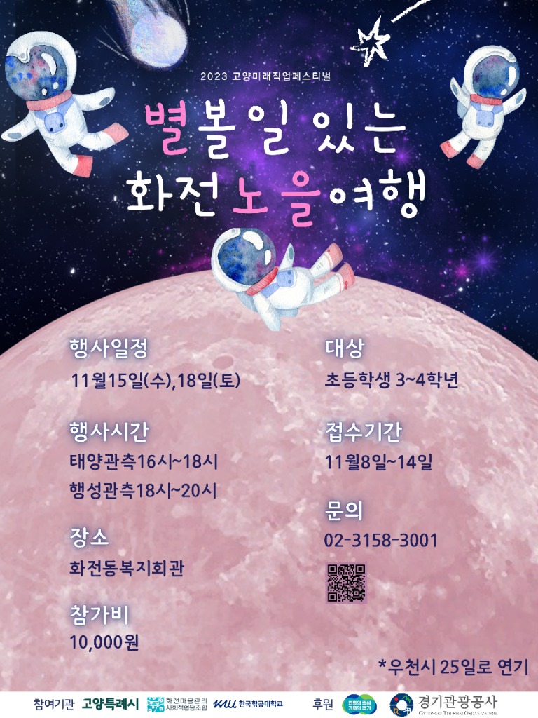 화전마을관리사회적협동조합과 한국항공대학교가 함께 기획해 운영하며, 초등학교 3~4학년을 대상으로 한 천체관측 체험 프로그램을 ‘노을 속 해님 관측’과 ‘가을밤 행성관측’으로 각각 오후 4시, 오후 6시에 2시간씩 두 차례 나눠서 진행한다.