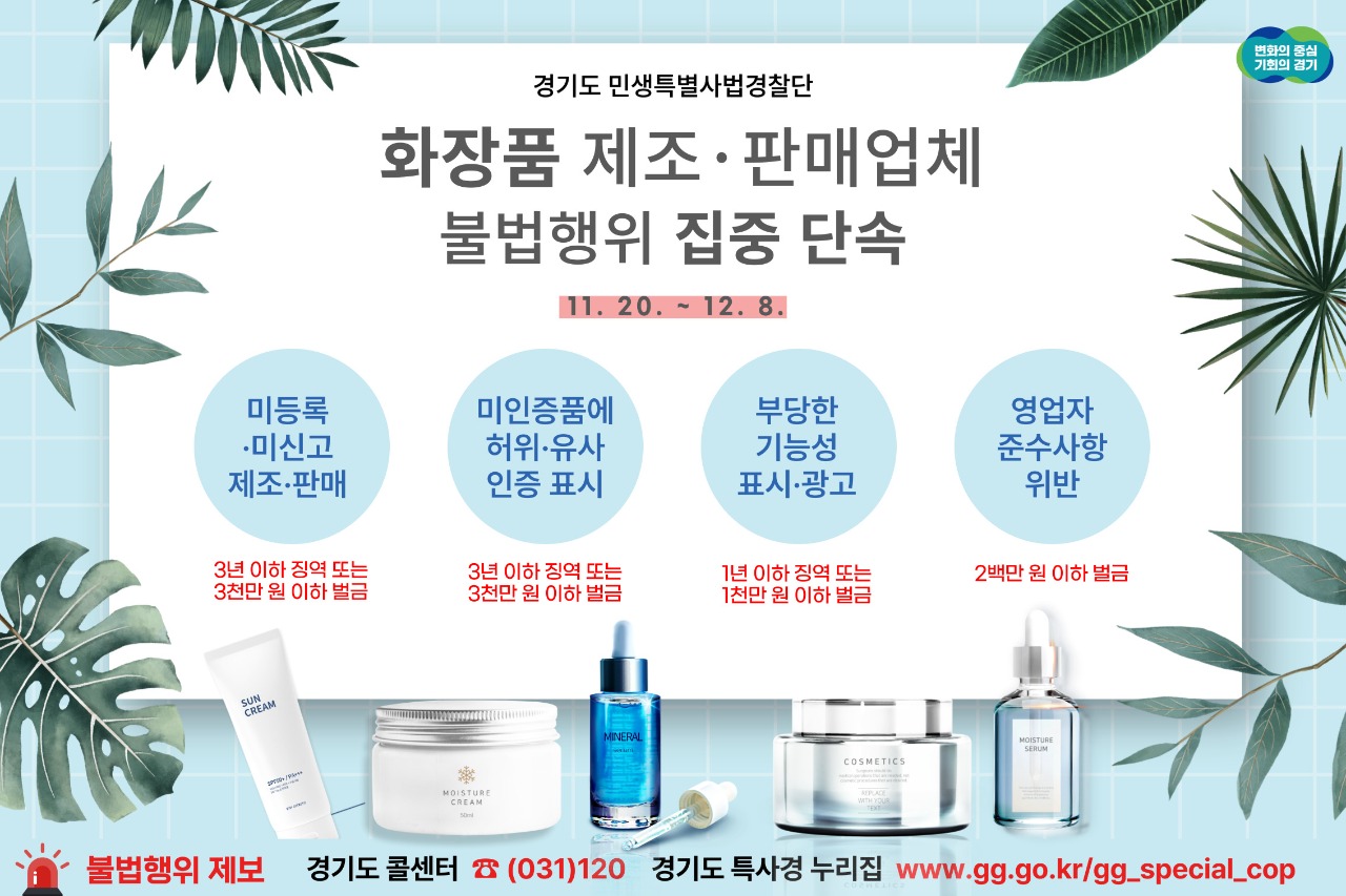 경기도 민생특별사법경찰단이 11월 20일부터 12월 8일까지 도내 화장품 제조업체, 책임 판매업체, 맞춤형 화장품 판매업체 등 90개소를 대상으로 불법행위를 집중 단속한다.
