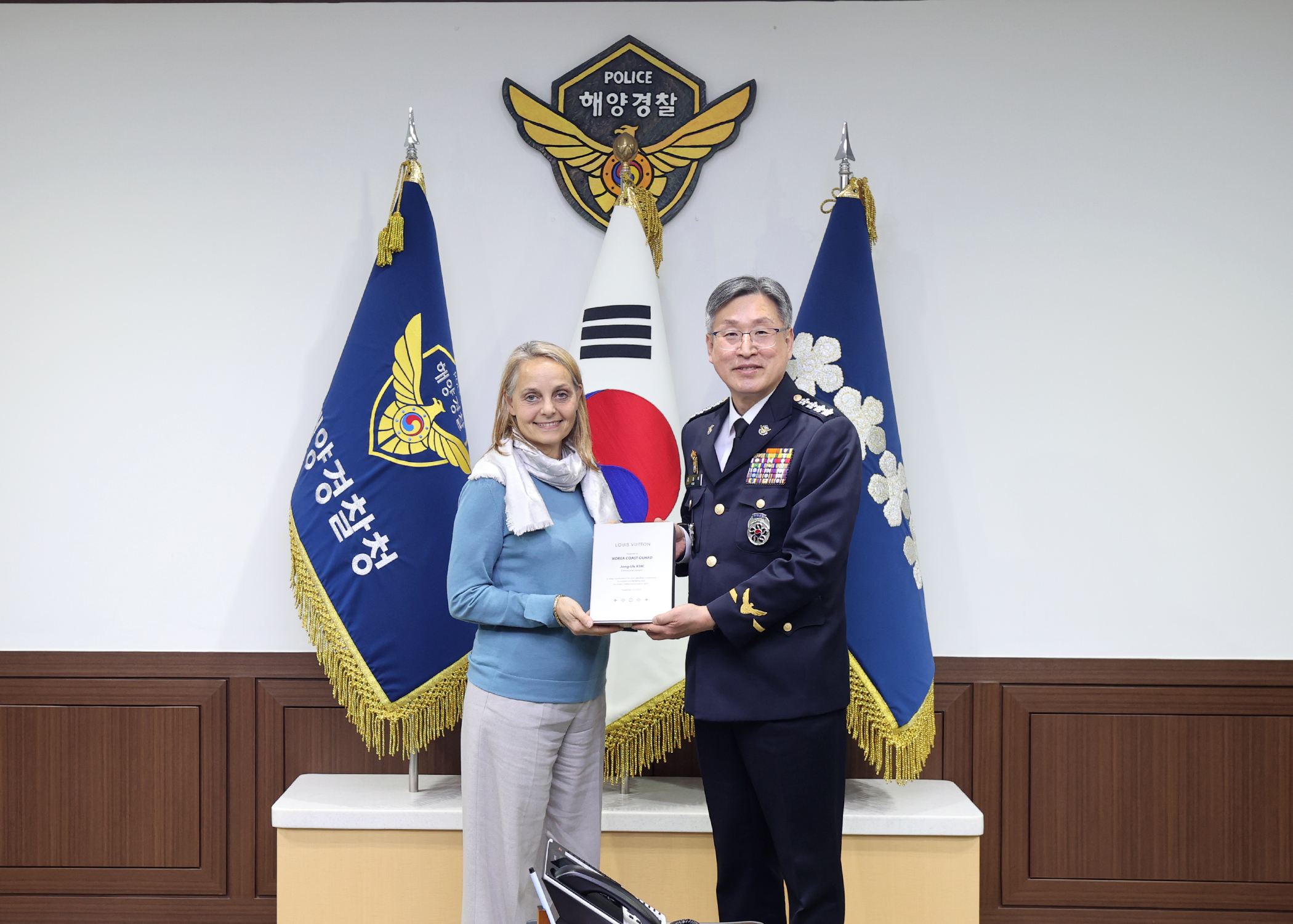 해양경찰청에 따르면, 루이비통(LVMH 社)를 대표해 프랑스 본사 지식재산권 보호 총괄이사 발레리 소니에(Valerie Sonnier) 등 3명이 해양경찰청을 방문하여 김종욱 해양경찰청장에게 감사패를 전달했다.