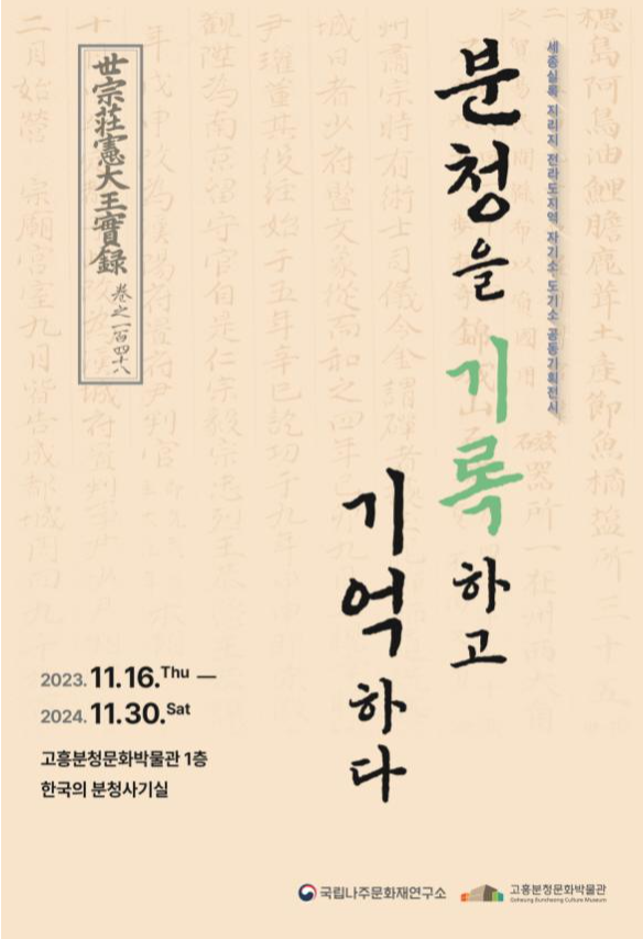 문화재청 국립문화재연구원 국립나주문화재연구소는 고흥군 분청문화박물관과 공동으로 11월 16일부터 2024년 11월 30일까지 고흥분청문화박물관 한국의 분청사기실에서 「분청을 기록하고 기억하다」 기획전시를 개최한다.